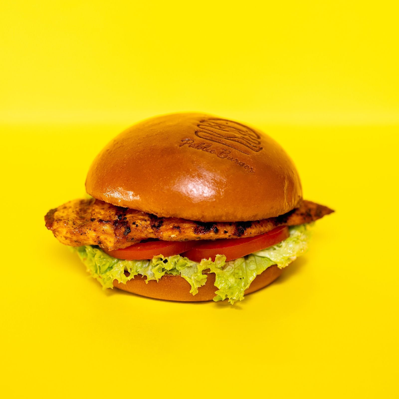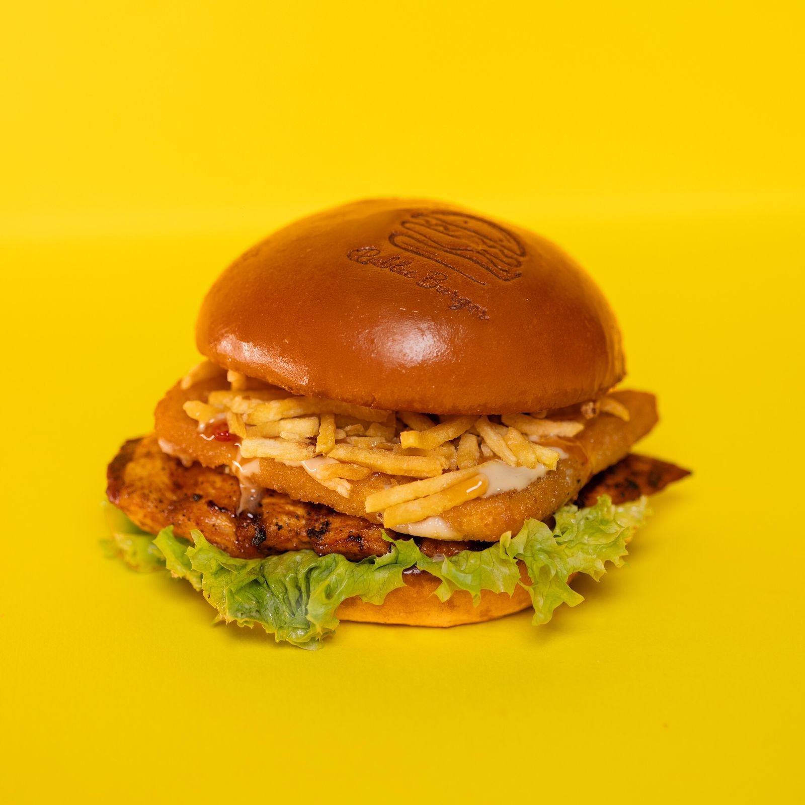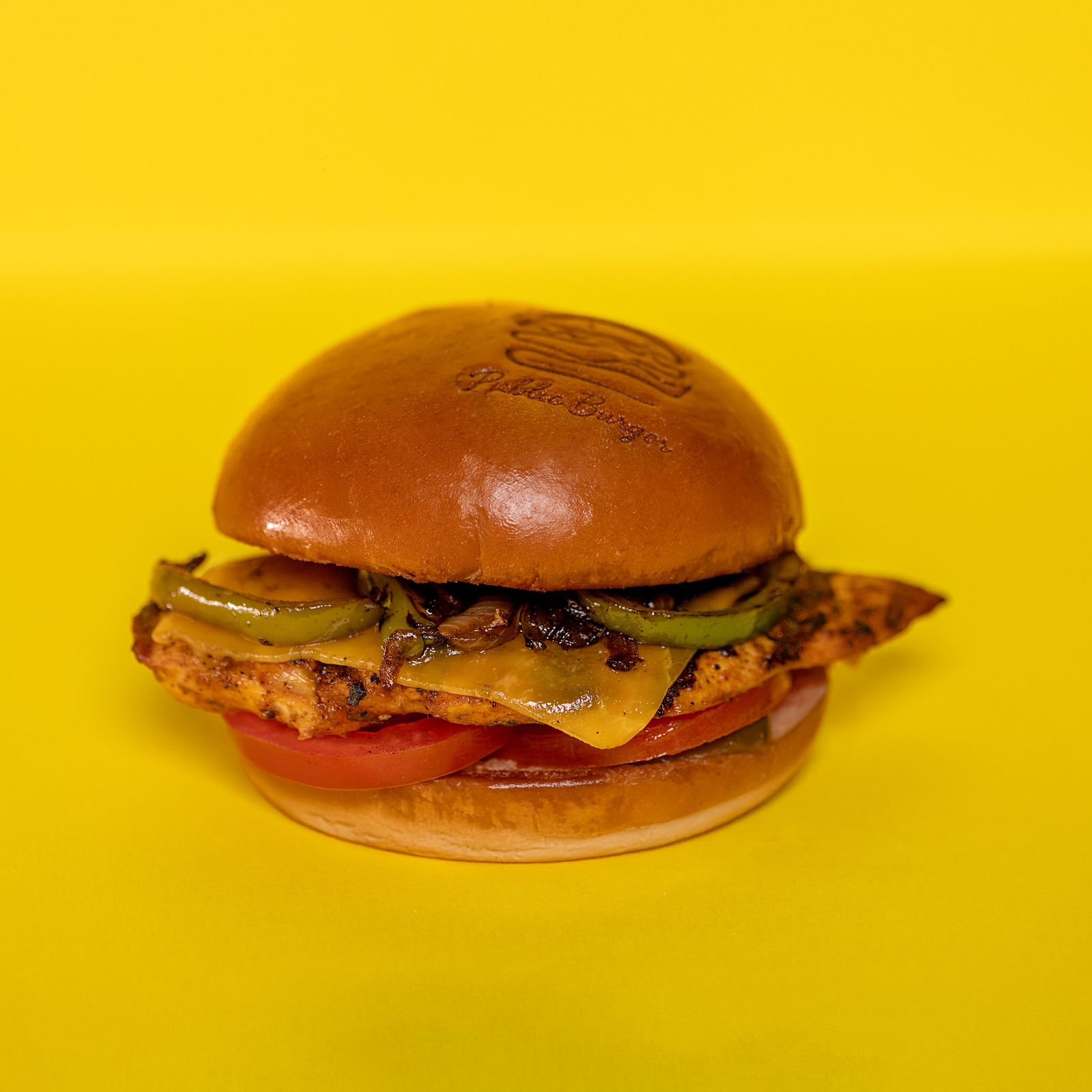 Double brioche bun, 130g Fresh grilling chicken breast, cheddar cheese, spicy sauce, jalapeño, tomato, grilled bell peppers, and grilled onions