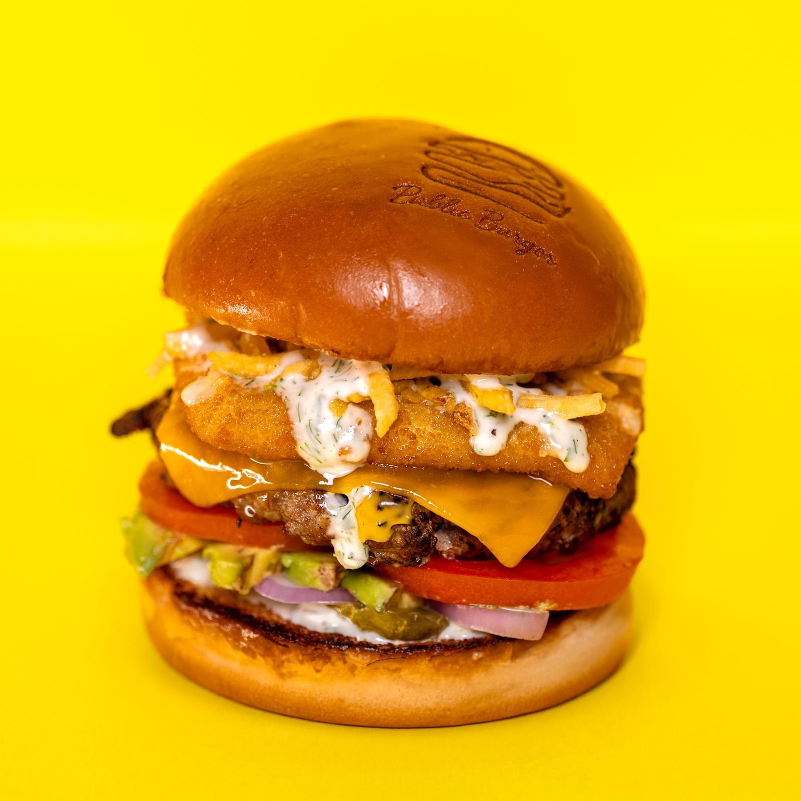 Double brioche bun, 200g grilled beef patty, cheddar cheese, breaded mozzarella, ranch sauce, dill pickles, tomato, red onion, avocado, crispy chips