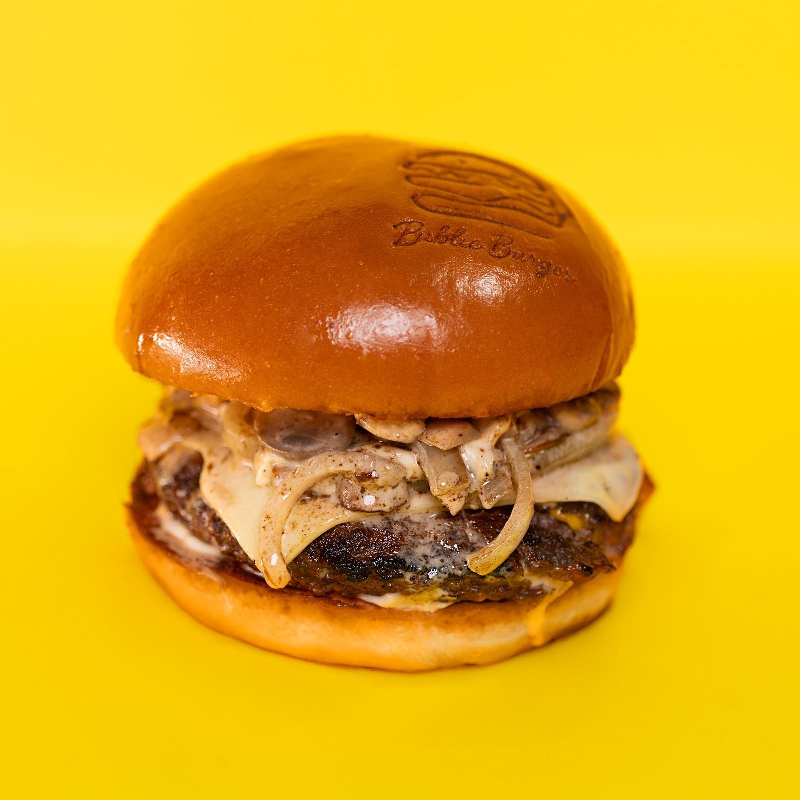 Double brioche bun, 120g grilled beef patty, topped with cheese, grilled fresh mushrooms and onions, mozzarella cheese, and mayo sauce