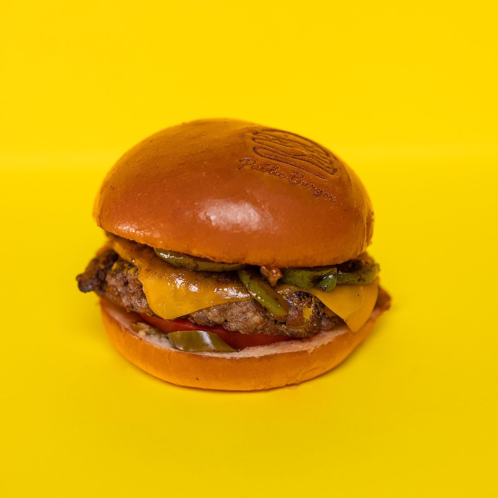Double brioche bun, 120g grilled beef patty, cheddar cheese, spicy sauce, jalapeño, tomato, grilled bell peppers, and grilled onions